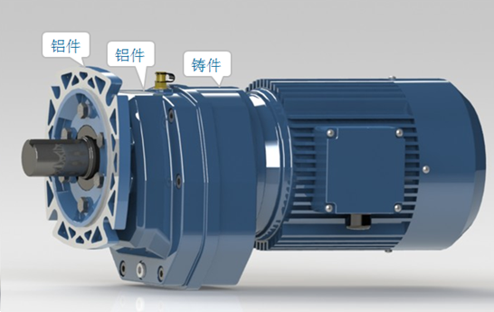(1)、輕量化設(shè)計 本款減速機(jī)首次采用鋁件(法蘭與箱體)與鑄件(端蓋)相結(jié)合的設(shè)計理念(如圖1),在保證強(qiáng)度的情況下,大化的減輕整機(jī)重量,使整機(jī)重量降至21KG(以接0.75KW電機(jī)為例)。同時端蓋采用鑄件材料能有效的揮發(fā)出高速級所產(chǎn)生的熱量,促使整機(jī)溫度平衡。